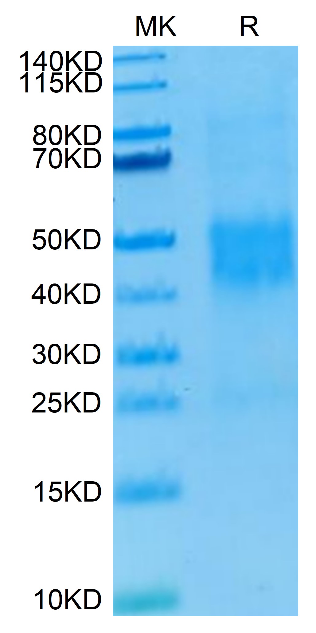 | The protein has a predicted MW of 15.3 kDa. Due to glycosylation, the protein migrates to 40-55 kDa based on the Tris-Bis PAGE result. |